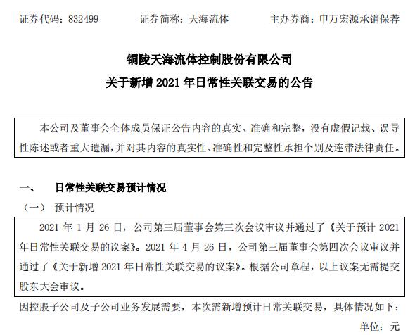 2021-013-天海流體-半于新增2021年預計日常性關聯交易的公告